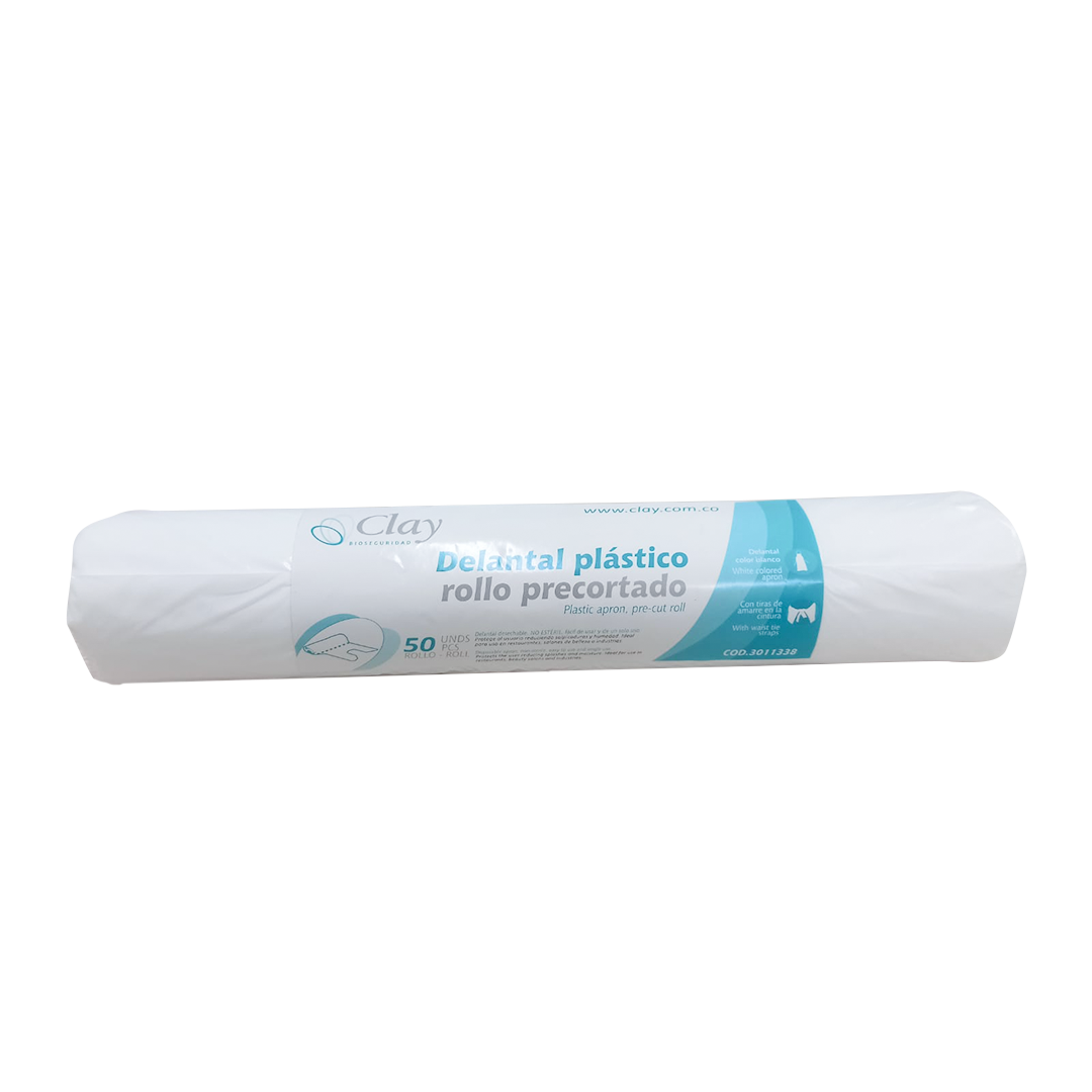 El Delantal Clay Rollo con Precorte está fabricado en polietileno de baja densidad pigmentado blanco, ofreciendo protección efectiva contra salpicaduras y humedad. Su diseño con tiras de amarre en la cintura brinda un ajuste cómodo y seguro para cada usuario.